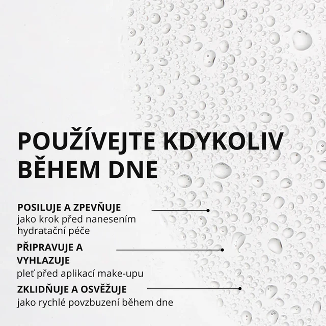 Multifunkčná hmla s obsahom ceramidov a kyseliny hyalurónovej podľa klinických testov zlepšuje hydratáciu pleti už po prvom použití. Vďaka exkluzívnemu peptidu Turmeric-146® pomáha redukovať začervenanie tváre a zároveň posilňuje odolnosť pleti. Prípravok umožňuje 3 rôzne spôsoby aplikácie – ako prípravu pleti pred nanesením krému, ako vyhladzujúcu bázu pod make-up alebo počas dňa na doplnenie hydratácie.