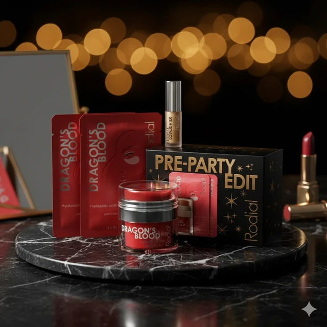 Darčekový set zahŕňa hneď dva prípravky s intenzívnou hydratačnou látkou – tzv. dračou krvou z amazonského pralesa známou pre svoje silné upokojujúce účinky. Obsahuje ju príjemne chladivá a spevňujúca hydrogelová očná maska a remodelačný pleťový gél, ktorý dokáže tvári navrátiť mladistvé rysy. Oba prípravky zanechávajú pleť dokonale žiarivú a pripravenú na aplikáciu tretieho produktu – univerzálneho korektora, ktorý prirodzene rozjasňuje pokožku.